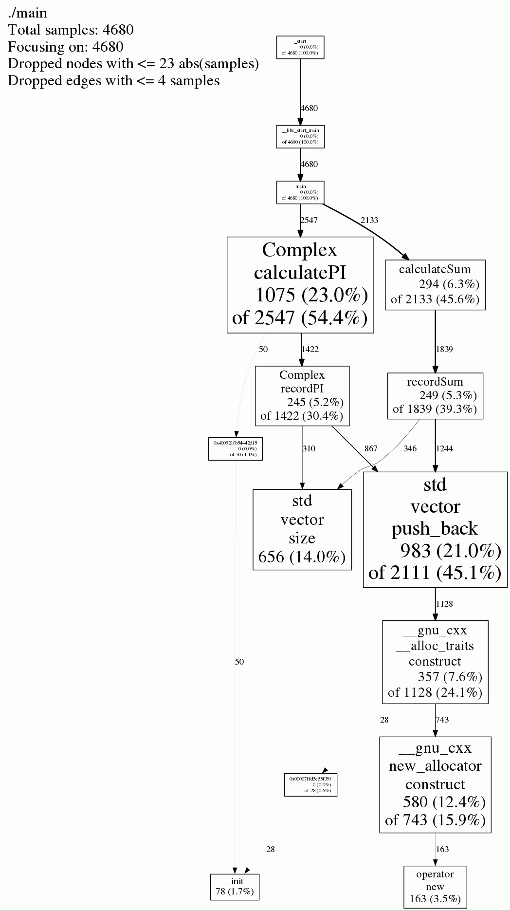 由图可知,Complex::calculatePI确实是性能瓶颈,占用了23.0%的时间,而calculateSum只占用了6.3%的时间。另外,我们刻意增加的recordPI和recordSum也占用了不少的时间,因为需要不断的push_back以及重新分配内存,所以占用的时间也很多。