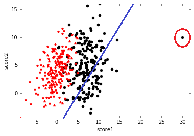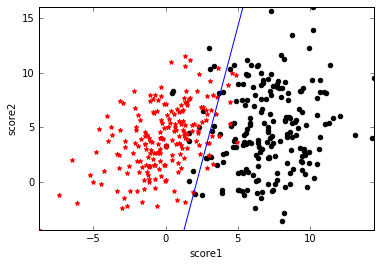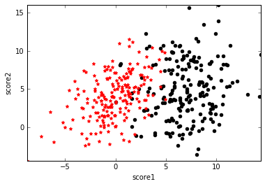 假设有一堆学生样本,为了简单起见,只有两个特征,分别是两门课的分数score1和score2,类标号y表示这个学生是否能被录取。可视化如下图,黑点表示y=1即被录取,红点表示y=0即未被录取,可以看到黑点处在score1和score2都比较高的区域。我们的任务就是给定这些训练样本,需要确定一个分类面来划分这两类数据。