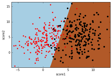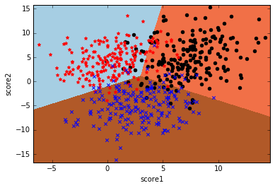 数据还是学生样本,只有两个特征,分别是两门课的分数score1和score2,类标号y表示这个学生是否能被录取。先上分类效果图: