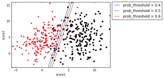 求解prob_threshold=0.6的分类面也不难,令\(g(\mathbf{x})=0.6\),得到\(f(\mathbf{x})=-lg(\frac{1}{0.6}-1)\),剩下的过程和\(f(\mathbf{x})=0\)是一样的。由此得到的分类面如上图的prob_threshold=0.6那条线,确实在prob_threshold=0.5的右边。类似的,可以画出prob_threshold=0.4的分类面。