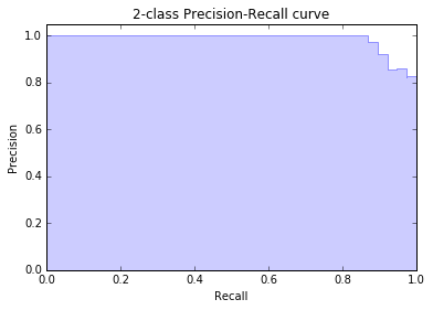 PRC曲线就是precision recall curve,由于上一步已经调用precision_recall_curve得到了不同阈值下的precision和recall,这一步直接拿来用就好了。为了防止画出来的曲线抖动形成毛刺,我们使用plt.step阶跃函数来绘制,起到平滑的作用。最后使用plt.fill_between填充曲线下方的面积。得到下图: