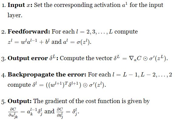 $$\begin{eqnarray} \delta^l = ((w^{l+1})^T \delta^{l+1}) \odot \sigma'(z^l),\tag{BP2}\end{eqnarray}$$从(BP2)可知,中间层的\(\delta^l\)可通过下一层的\(\delta^{l+1}\)递推计算得到。这正体现了误差反向传播的思想,即误差从输出层反向一层一层传到输入层,所以正好可以通过(BP1)和(BP2)计算到所有层的\(\delta^l\)。