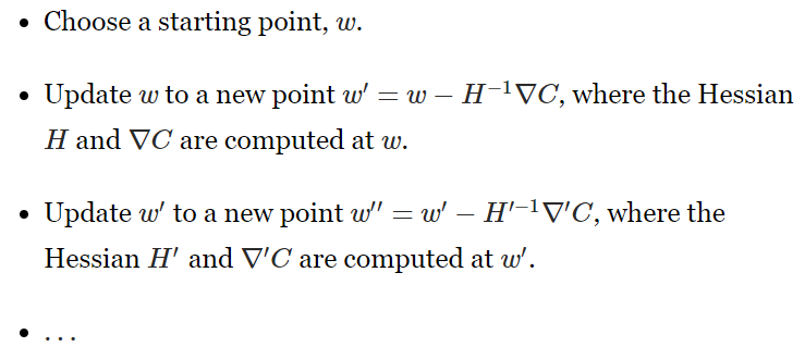 $$\begin{eqnarray}\Delta w = -H^{-1} \nabla C.\tag{4}\end{eqnarray}$$所以我们可以通过如下方式更新\(w\)已达到最小化\(C\)的目的,当然也可以给\(\Delta w\)乘上学习率\(\eta\)。