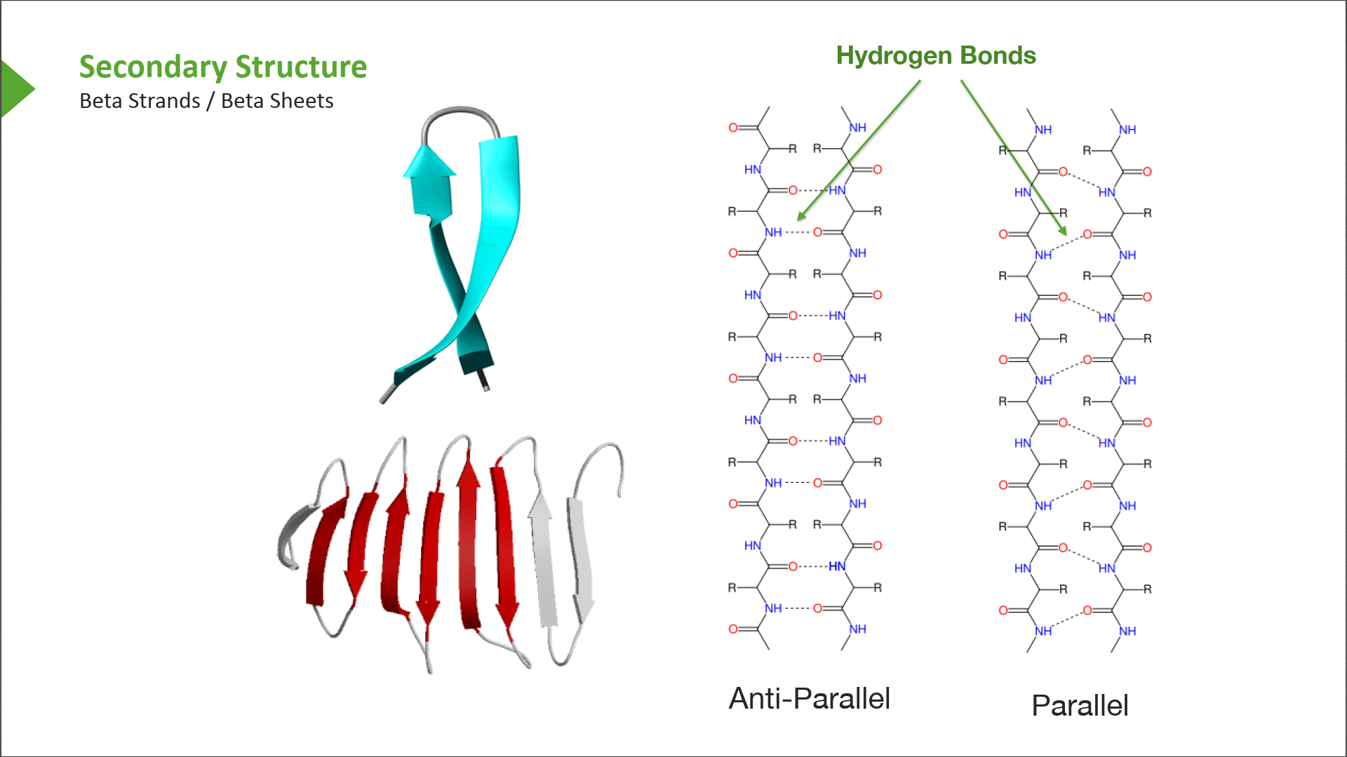 二级结构就是在一级结构的字符串的基础上,肽链怎样进行盘旋、折叠等变换,形成一种局部的三维结构,这种局部的三维结构通常由氢键支撑。常见的二级结构有α螺旋和β折叠,如下图所示。其中α螺旋的每个残基的-NH的H和临近的第4个残基的-CO的O形成氢键,由此支撑α螺旋的结构稳定性,如下图的箭头所指虚线。β折叠则是两条肽链,平行排列,对应残基的-NH的H和-CO的O形成氢键,由此形成两股β折叠的结构,多股β折叠形成类似手风琴的样子。β折叠分为平行和反平行排列,我们前面介绍到肽段分为N端和C端,如果形成β折叠的两股链都是从N到C(或从C到N),则称为平行排列,否则是反平行排列。每股β折叠都有一个大箭头表示其方向。