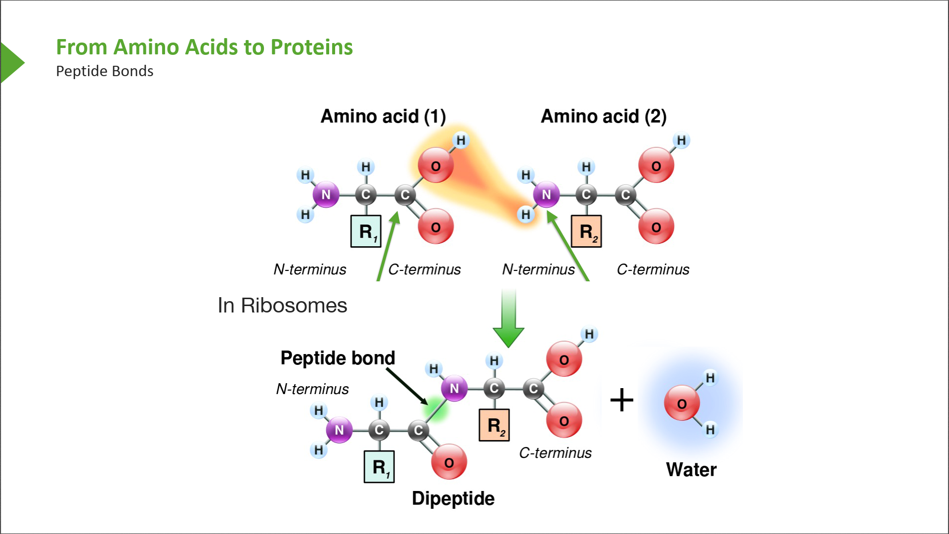 20种氨基酸连接的方式为脱水缩合,即一个氨基酸的羧基-COOH和另一个氨基酸的氨基-NH2反应,丢掉一个H2O,形成一个肽键-CO-NH-,如下图所示。丢掉了羧基和氨基的氨基酸被称为氨基酸残基,这个名词很形象,氨基酸缺胳膊少腿,所以变成了“残”基。