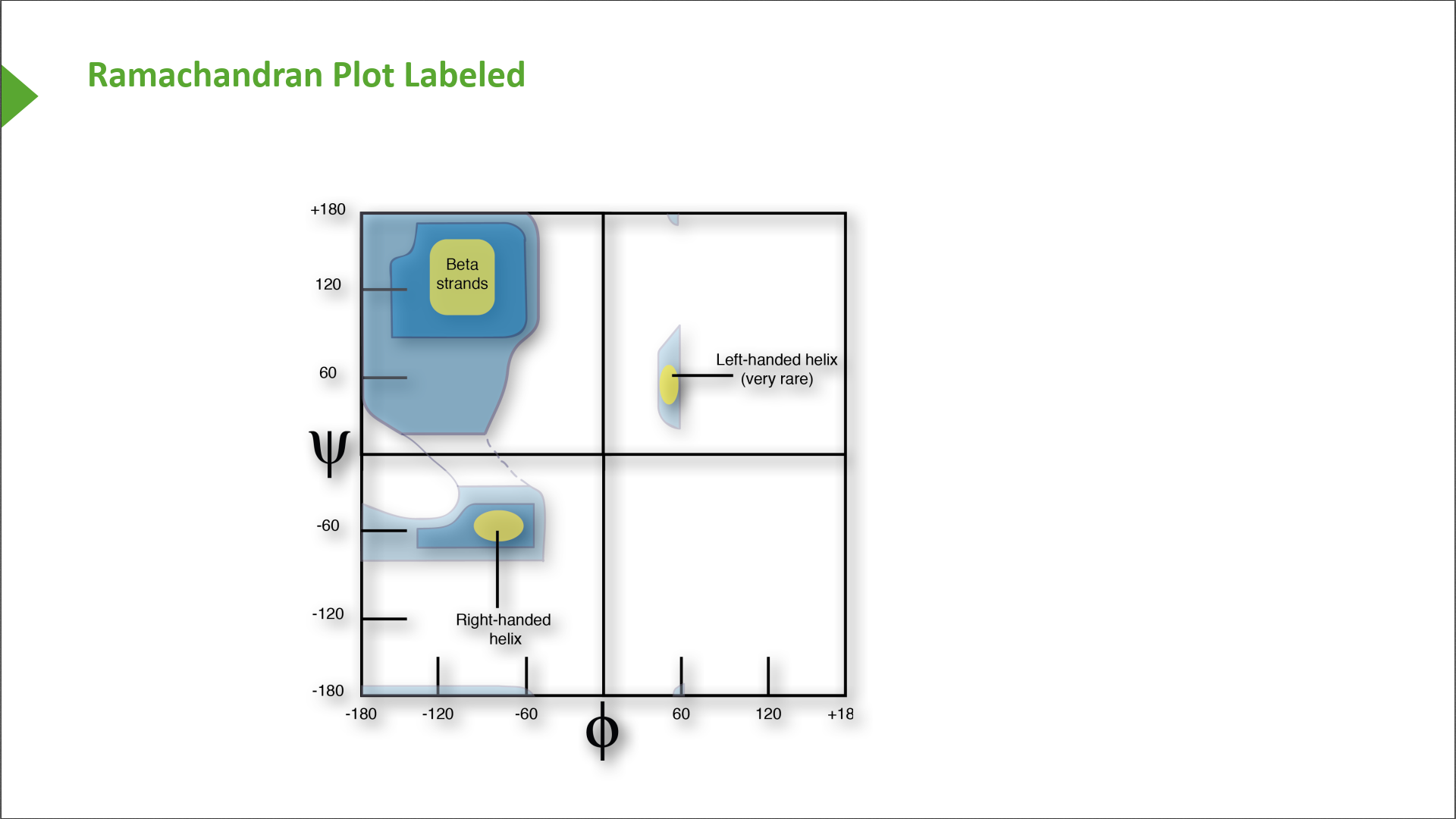 事实上,扭转角ϕ和ψ并不是在360°范围内随机均匀分布的,1963年就有科学家统计过扭转角ϕ和ψ的分布,他们发现稳定的蛋白质结构的ϕ和ψ通常只分布在一小部分区域,如下图的拉氏图所示,这些区域正好对应了常见的α螺旋和β折叠的结构。