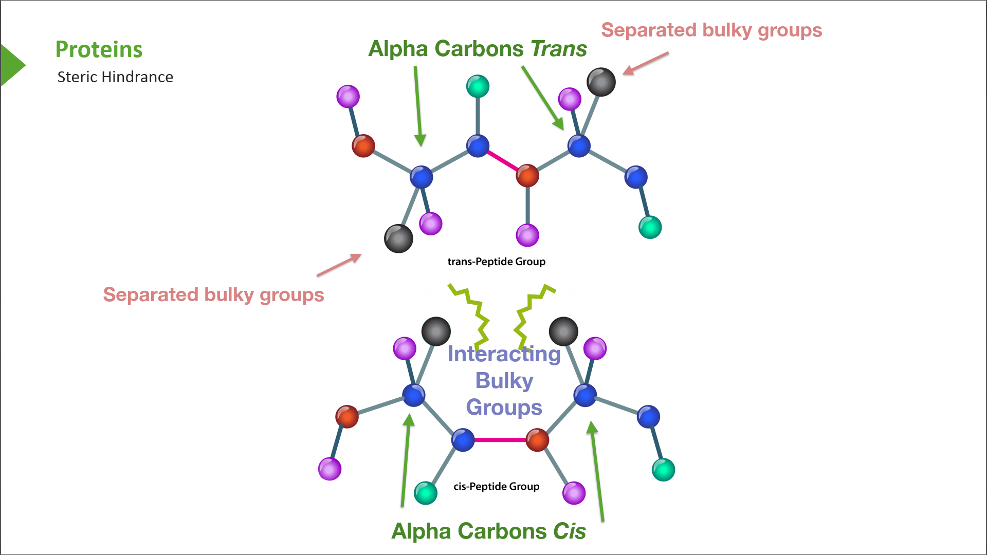 最后,我们还需要介绍一个角度,那就是ω。前面提到,虽然肽键具有双键的特点,难以旋转,但它在少数情况下还是可以旋转的。假设通常情况下,肽键的角度定义为ω=0°,如下图所示,红色的键即为肽键,这种结构的好处是它能让形成肽键的两个残基的侧链R(图中黑色基团)离得尽量的远,这样能保持比较稳定的结构。如果肽键旋转为ω=180°,变为下图的样子,则两个侧链R很靠近,就产生位阻效应,就不稳定,所以这种情况比较少见。但不管怎么说,肽键的扭转角ω也是一个变量因素。
