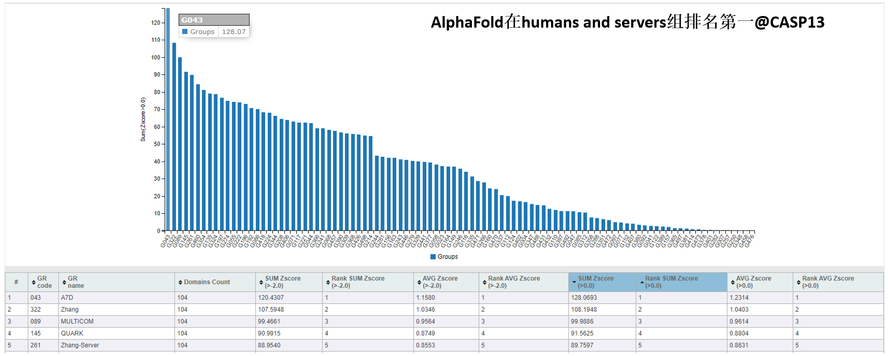 AlphaFold参加了CASP13的humans and servers组,第一次参赛就一鸣惊人,获得冠军并甩开第二名好多。