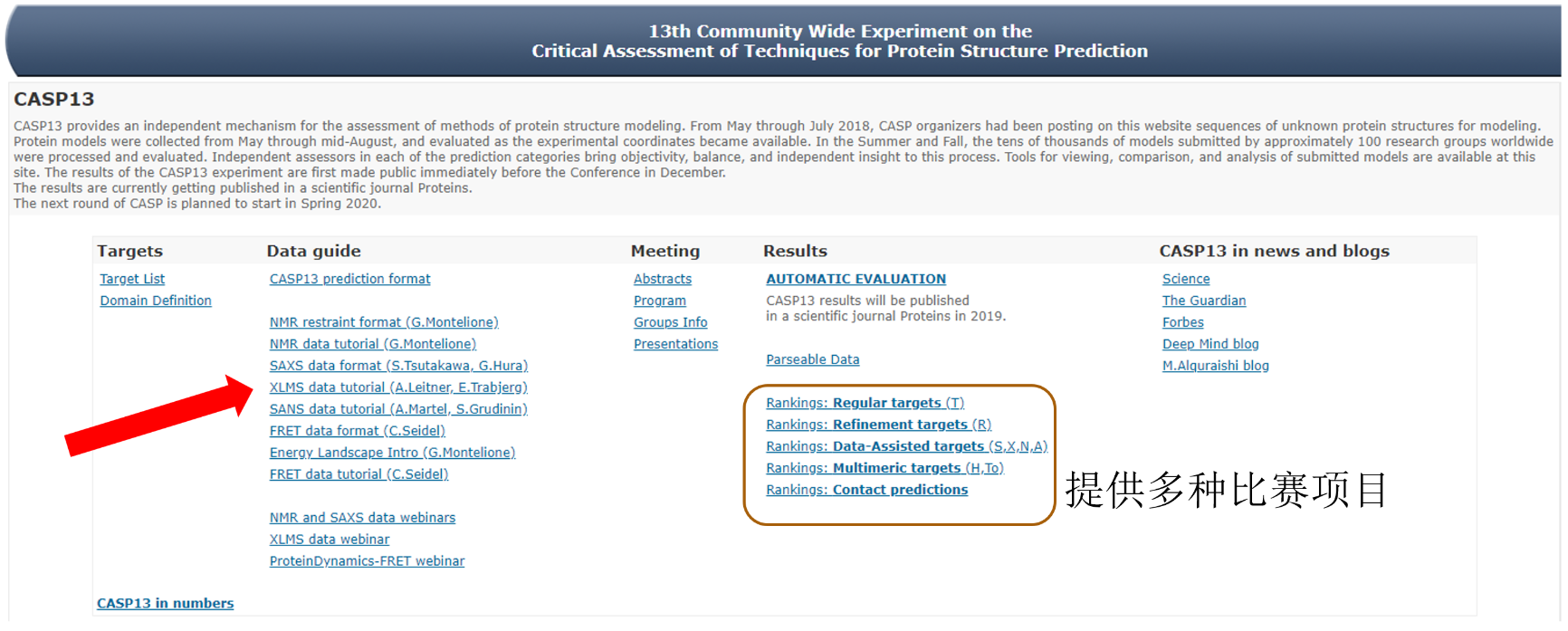 CASP同时提供多种比赛项目,比如常规的结构预测(Regular targets)、数据辅助预测(Data-Assisted targets)和蛋白质接触面预测(Contact predictions)等,其中数据辅助预测中提供了核磁数据(NMR)、交联数据(XLMS)等,对的,交联数据就是我目前研究的pLink处理的数据。