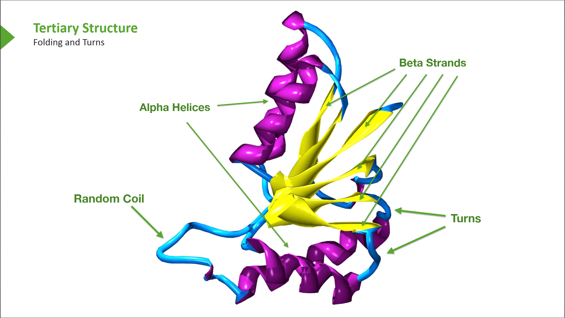 简单理解,三级结构就是把多个二级结构拼接到一起,折叠成一个完整的蛋白质三维结构,如下图所示。维持蛋白质三级结构的力比较多样,除了氢键之外,还有二硫键、金属键等。