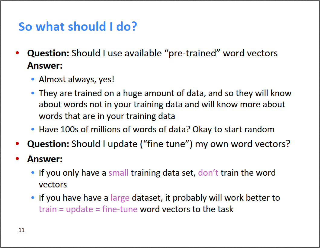 我们知道词向量其实是NLP实际任务中的副产品,任何一个NLP任务都可以得到词向量。这就存在一个问题,当我们在实现一个具体的NLP任务时,是使用预训练的词向量,还是根据实际任务现场训练一个词向量呢?建议是,如果有可用的预训练词向量,则最好使用预训练词向量。因为预训练的词向量通常在很大规模的数据集上进行过训练,词向量的质量还不错,而某个具体的NLP任务的样本数可能不太多,导致训练得到的词向量还没人家预训练的好。所以,如果实际任务的数据量较小,则用预训练的词向量;否则,可以尝试一下根据实际任务fine tune词向量。