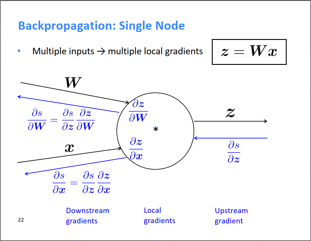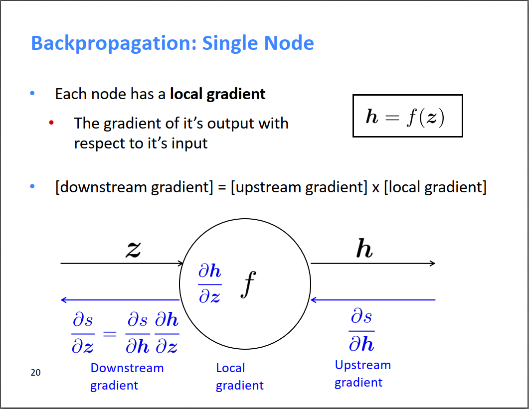 这节课的核心就是不断使用链式法则对BP算法求导,然后反向传播。在反向传播的过程中,可以利用上游计算好的梯度,增量式的更新下游的梯度,如下图所示,就是公式[downstream gradient] = [upstream gradient] × [local gradient]。这个在之前介绍BP网络的时候也提到过,其实就是那篇博客的(BP2)公式,误差对\(w\)的偏导可以通过误差对\(b\)的偏导乘以神经元输出得到。