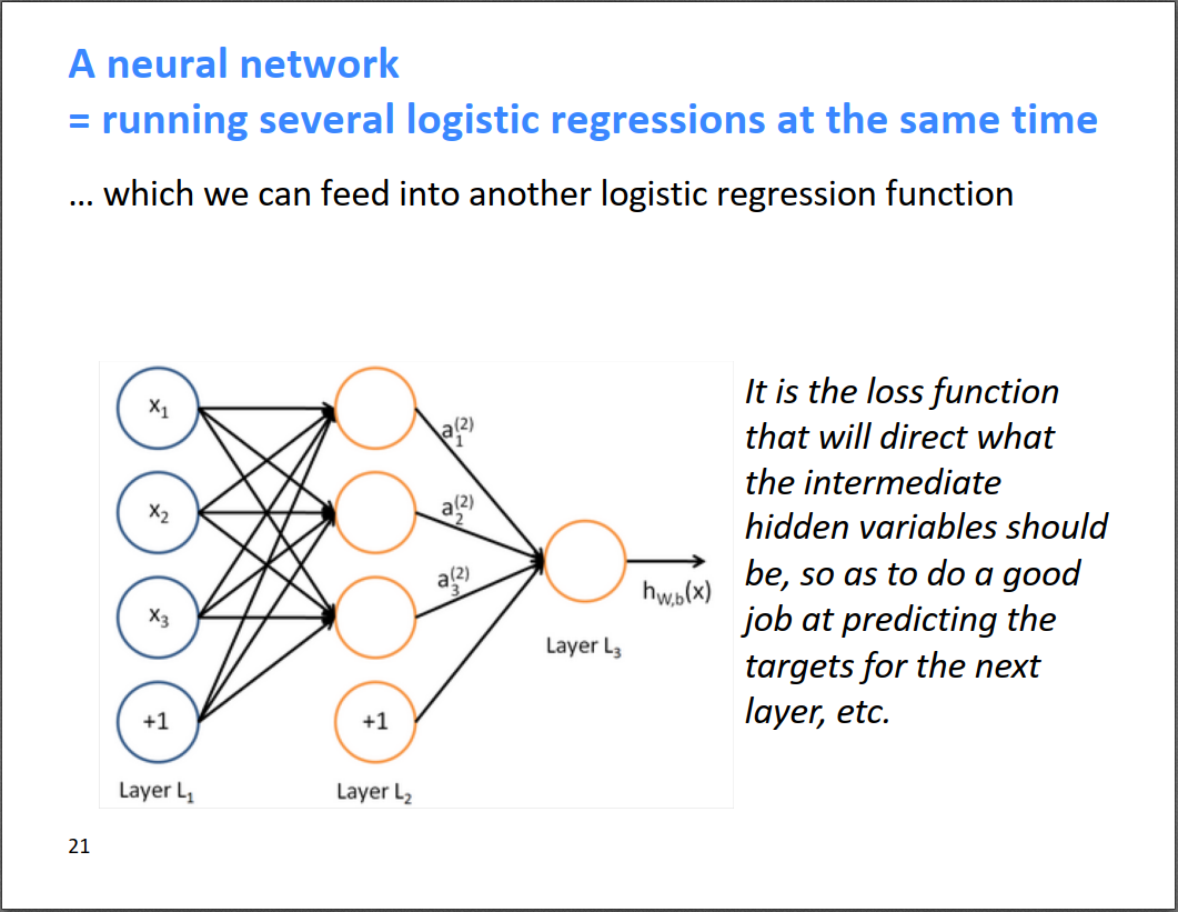 使用神经网络进行表示学习,不用输入的x直接预测输出,而是加一个中间层(图中橙色神经元),让中间层对输入层做一定的变换,然后中间层负责预测输出是什么。那么中间层能学到输入层的特征,相当于表示学习,自动学习特征。对于word2vec,中间层就是词向量。