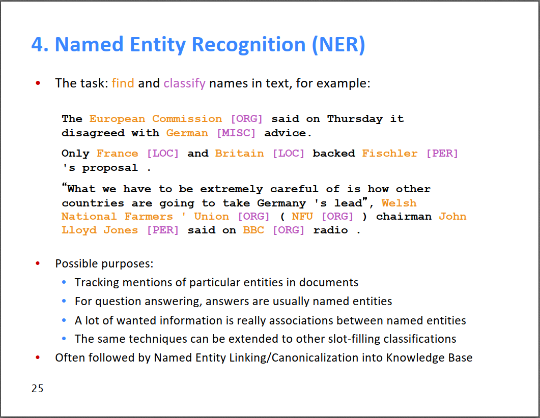命名实体识别(Named Entity Recognition, NER),任务是把一个句子中的一些实体词识别出来,比如下图中识别出地点LOC、机构ORG和人名PER等。通常采用的方法是把需要判断类型的词及其周围的几个词的词向量拼接起来,输入到神经网络进行分类。但是由于一个句子中真正的实体词较少,而很多其他词Others会很多,导致样本不均衡,此时需要进行采样,具体方法可以搜索怎样处理NER样本不均衡的问题。