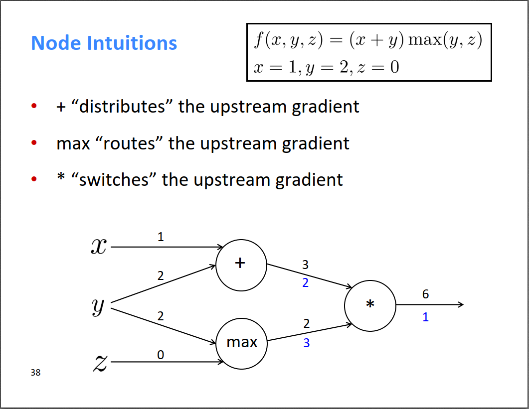 很有意思的是老师总结到:加法相当于把上游的梯度分发给下游;max相当于路由;乘法相当于开关。听老师讲下面的实例会有切身的体会。