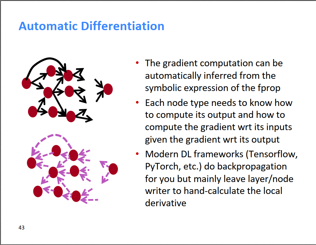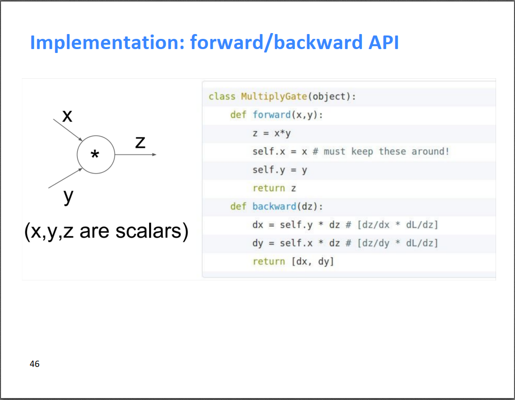当然,现在的流行的神经网络框架都帮我们完成了自动求导,我们只需要把local gradient定义好,框架会自动帮我们进行反向传播。需要定义的就两点,一个是正向经过该神经元,output=forward(intput);另一个是反向经过该神经元时,input_gradient=backward(output_gradient)。下面第二个图是一个很简单的例子,定义了forward和backward两个操作。