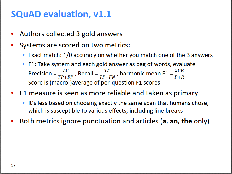 QA系统的评价指标有两个,一个是确定性匹配Exact match,即对于每个问题,模型给出的回答如果和3个答案中的任意一个完全匹配,则加1分,否则不加分。另一个是F1指标,使用词袋模型(不考虑词的顺序),对于每个问题,模型给出的回答和3个答案中的每一个计算F1,这个问题的F1是3个F1的最大值,最终得分是所有问题的F1打分的均值。Exact match和F1都不考虑标点符号和冠词。相对来说,F1比Exact match更可靠和鲁棒一些。