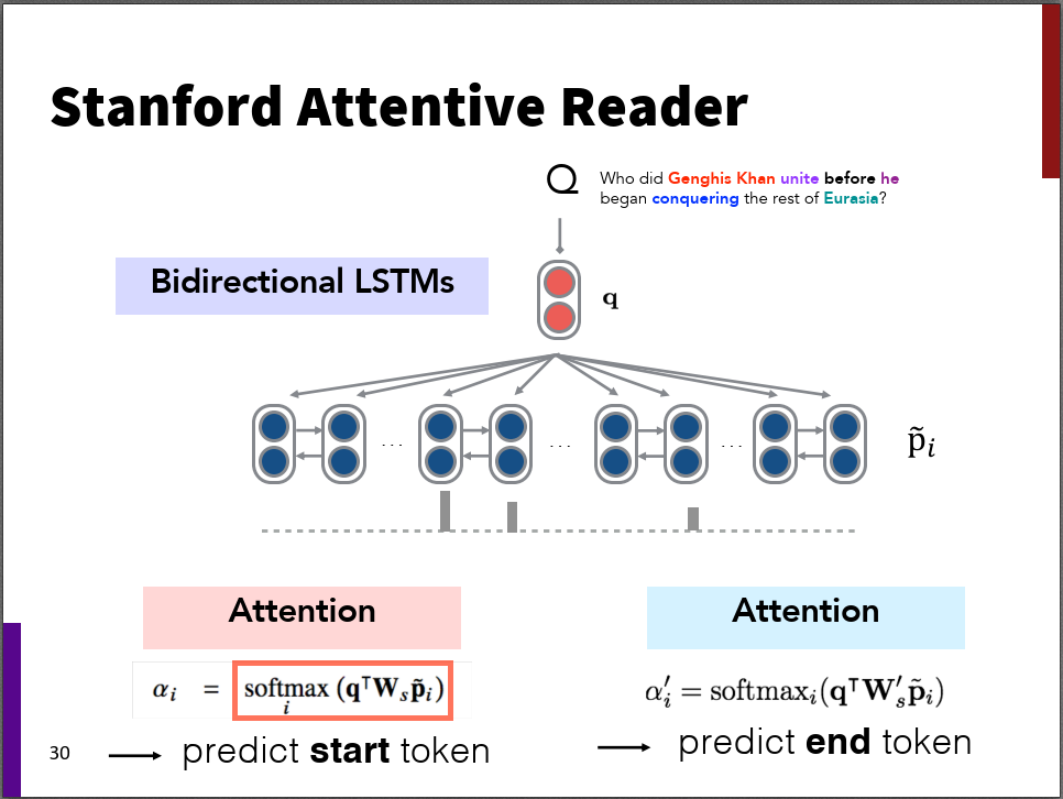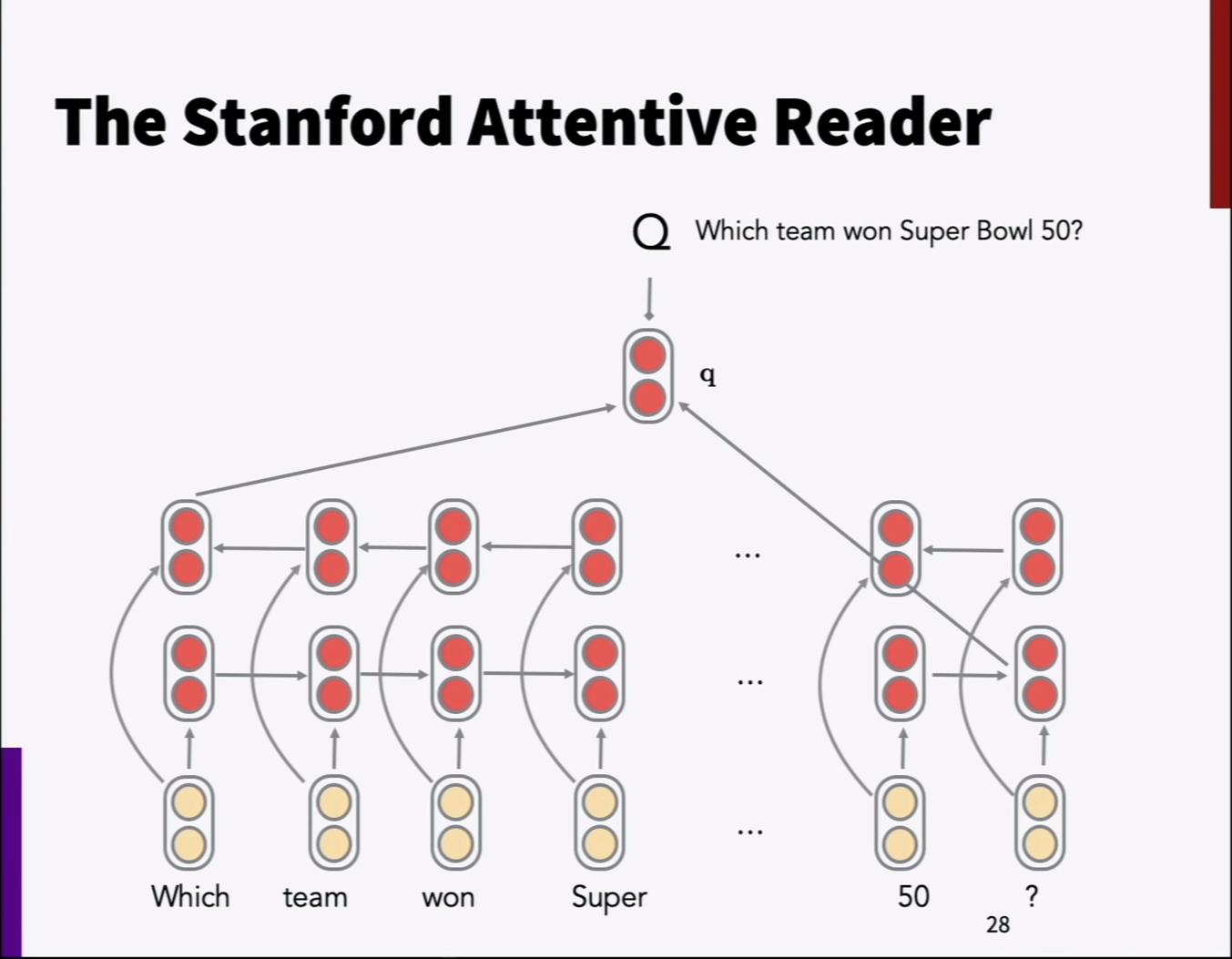 下面介绍一下Chris Manning组针对SQuAD数据集开发的QA系统——Stanford Attentive Reader。该系统目前虽然不是最好性能,但它包含QA的基本模块,可以作为QA的一个baseline模型。