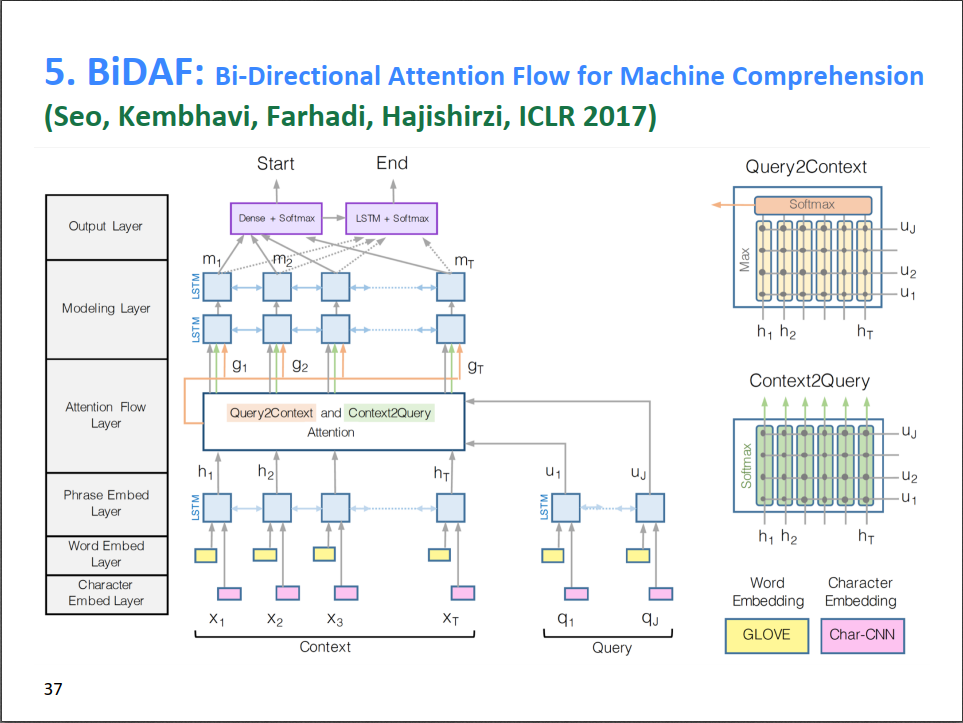 另一个比较流行的QA系统是BiDAF,如下图所示,这里不再详细介绍。它的特点一方面输入不仅包含词向量,还包含字符级别的特征。另一大创新是在Attention Flow Layer,相对于Stanford Attentive Reader,BiDAF的Attention是双向的,不但包含q对P的Attention,还包含P对q的Attention。
