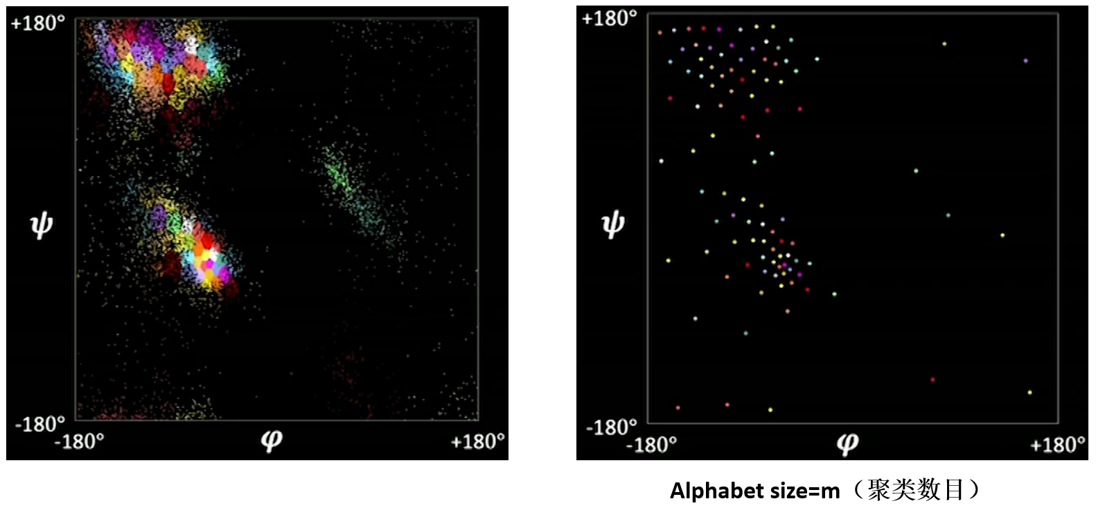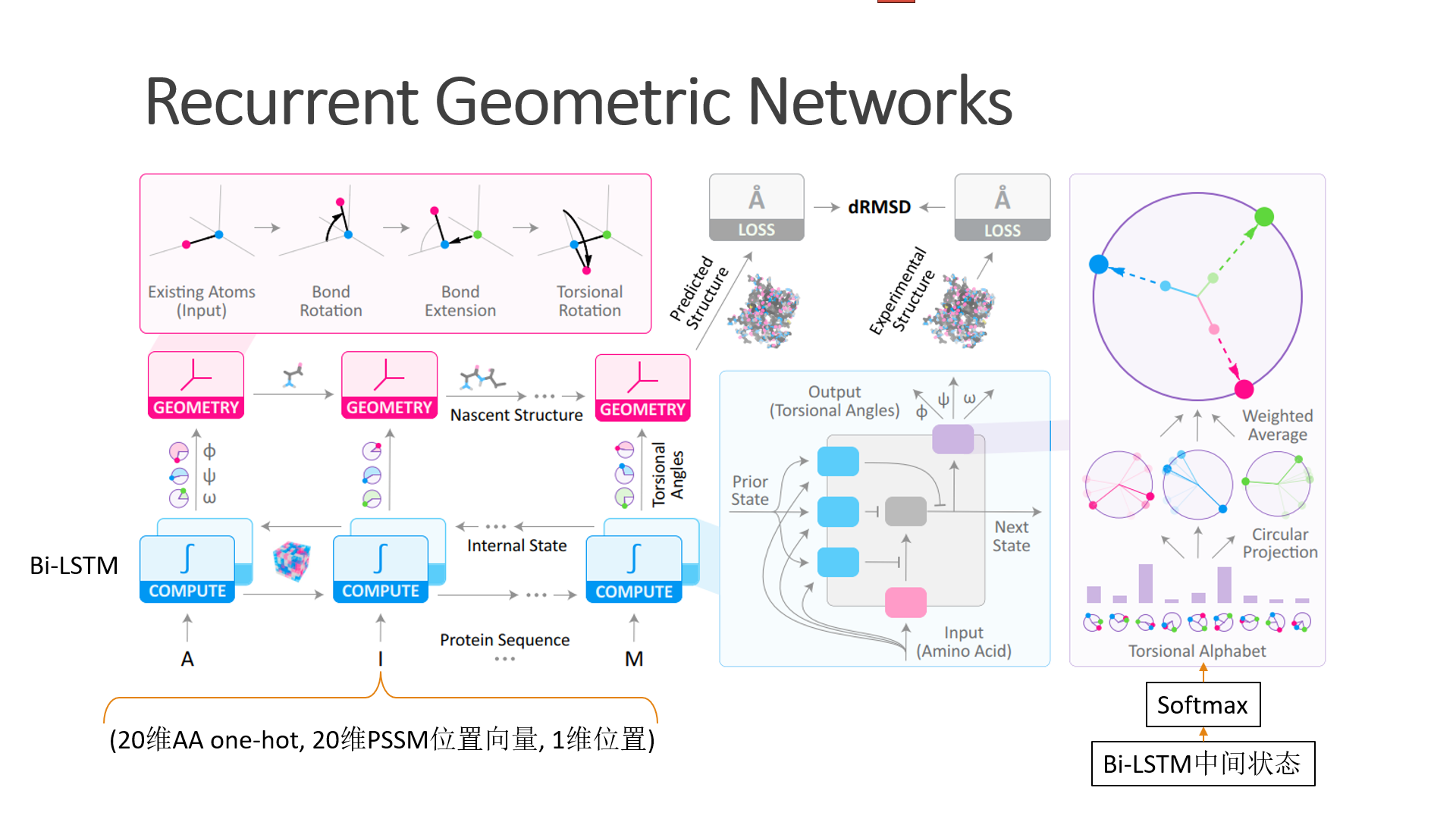Bi-LSTM的输出是三个扭转角,但并不是三个实数这么简单。作者首先把整个拉氏图平面聚类,比如聚类成m=60个点,然后就把输出离散化成60类的分类问题。分类输出采用Softmax归一化,这样就会得到60类的概率分布,如RGN网络图最右边的子图所示。60类的概率分布再通过加权平均的方式得到最终的三个扭转角的实数值。我很好奇为什么需要经过一个离散再加权平均的方法,Bi-LSTM直接回归输出三个扭转角的实数不是更省事吗?