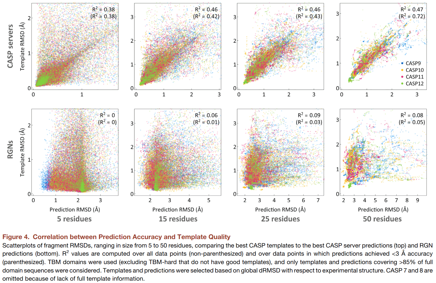 另外,作者提到,在TBM类别的数据集中,CASP的参赛模型比较依赖模板的质量。具体来说,对于真实的结构,如果模板结构和真实结构误差很小(y轴),则模型的预测结构和真实结构的误差也很小(x轴),这两个变量成一定的线性相关关系(第一行)。而对于本文的RGN,则没有这种相关关系,说明RGN一视同仁,不会受模板质量的影响,因为RGN是纯深度学习的模型,根本就没有用到模板。
