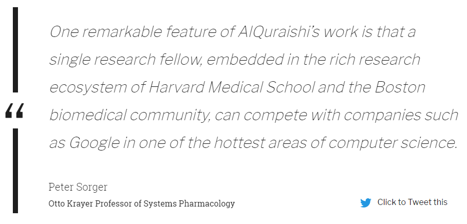 本文作者来自哈佛医学院系统药理学实验室,文章只有作者一个人,很了不起了。哈佛医学院的另一个教授评价作者:“AlQuraishi 研究的特点在于,一名埋头在哈佛医学院和波士顿生物医学社区丰富研究生态系统中的研究人员,居然能够在计算机科学最热门的领域里抗衡谷歌等巨头。——Peter Sorger”,太棒了,我也想做这样的研究。