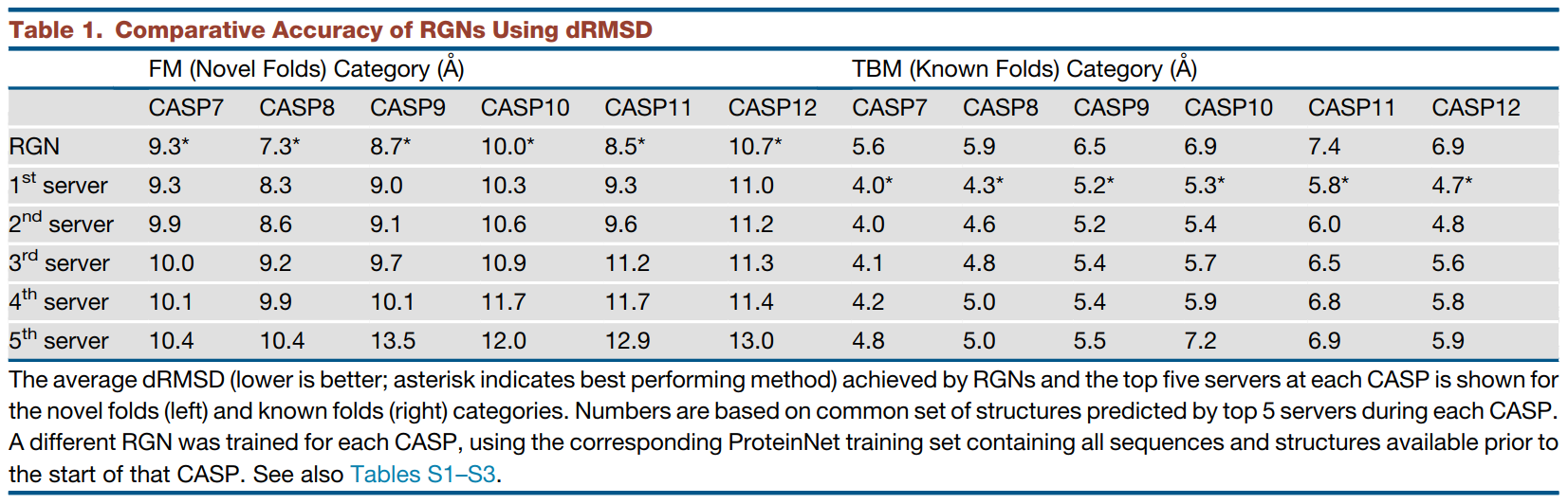 测试结果如Table 1所示,可以看到,在没有模板的FM类别中,本文的RGN预测误差是最小的;在有模板的TBM类别中,RGN的性能几乎垫底,当然这里参与评测的都是当届比赛中Top-5的模型,所以RGN和这5个模型比是垫底,但差距是很小的。