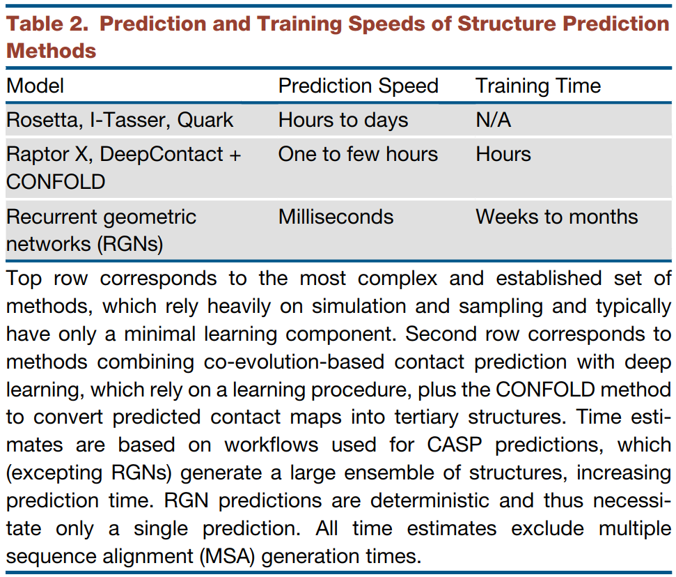 在预测速度上,RGN虽然需要训练几周甚至上月的时间,但预测速度是毫秒级别的,是评测的几个模型中最快的。快速的RGN能使一些新的应用成为可能,比如药物发现、蛋白质设计等。