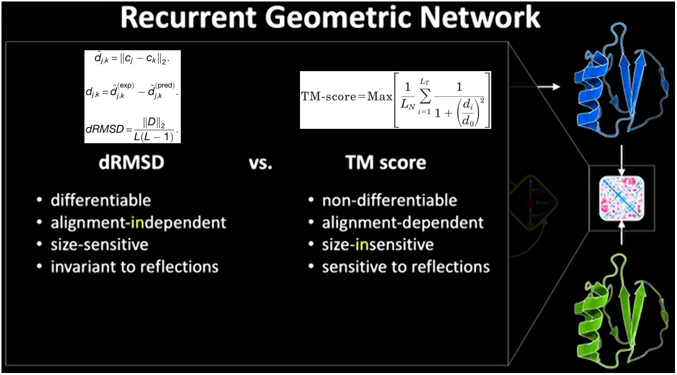 上述dRMSD误差相比于之前领域内常用的TMscore,好处就是可微分,可自动求导,可梯度下降了;另外,如上所述,dRMSD不要求预测结构和真实结构进行对齐;但是有一点是dRMSD对size敏感,而且不能识别镜面对称这种错误结构,比如左手和右手的结构是镜面对称的,如果真实结构是左手,但模型预测成了右手,dRMSD是检测不到这种错误的。