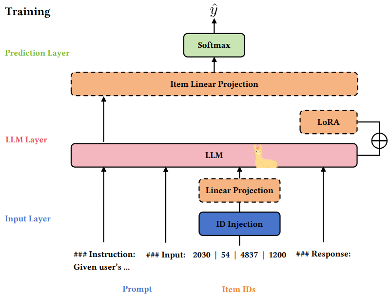 LLM4SR的基本范式如下,即用LLM直接来做搜推的范式(这种方式在学术界常见,但在工业界不常见)。由于LLM的输入词表范围是有限的(通常比较小),因此其token emb dim通常比较大,比如2048或者4096;而搜推场景的item量级很大,而且在不断更新,因此工业界经典的id-based的搜推模型的item emb dim通常比较小,比如64或128。经典的id-based的搜推模型能比较好地学习到搜推场景的协同信号,为了让LLM模型也能感知这种信息,LLM4SR范式通常会先预训练一个id-based的经典搜推模型,然后将其中的item id emb通过下图的Linear Projection的映射层,映射到LLM token emb的空间,让LLM也能感知搜推的协同信号。