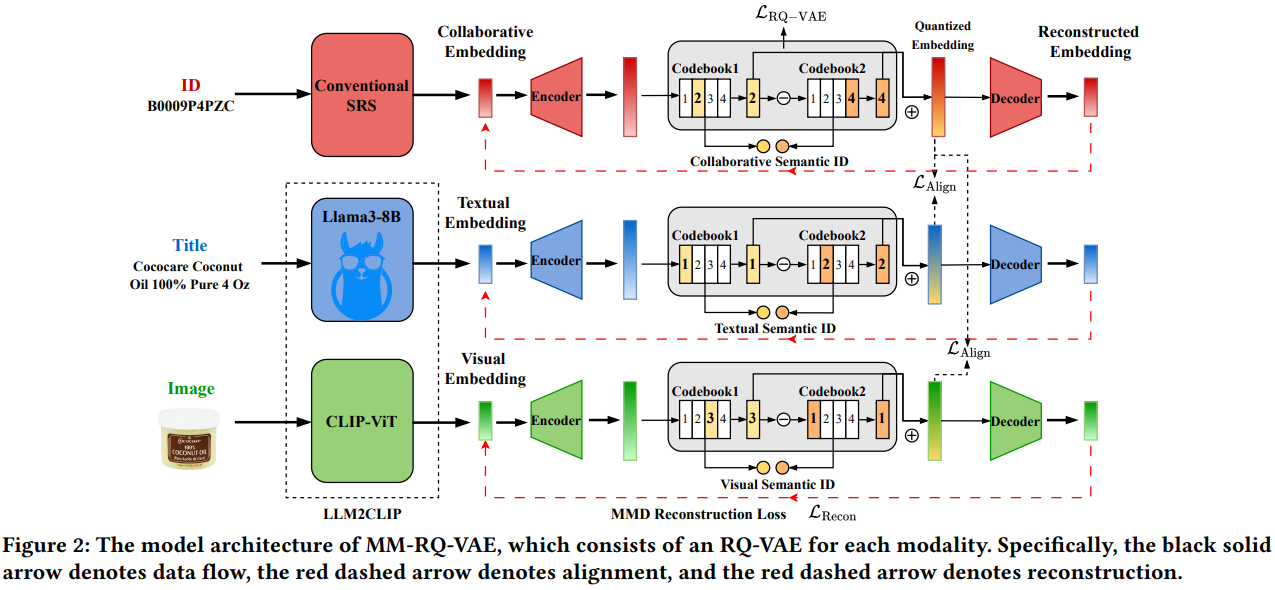 - 对量化后的emb做了对齐,因为LLM2CLIP本身进行了图文模态的对齐,所以文中只新增了id emb分别和文本、图片模态的对齐