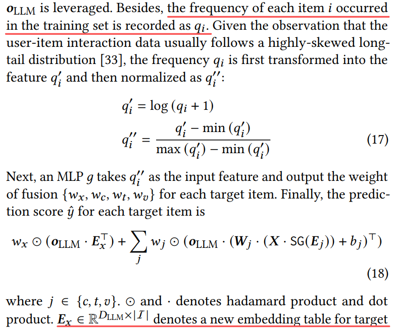 - 最后在LLM4SR输出层,有一个Multimodal Frequency-aware Fusion模块,next token prediction任务相当于一个n分类任务。在这个模块中,对target item也会新增一套emb talbe,这样总共就有4套emb table了。然后词表中每个item会根据热度过一个函数得到四种模态的emb的权重,然后4个emb进行融合。通过这种方式也能一定程度上缓解维度坍缩。