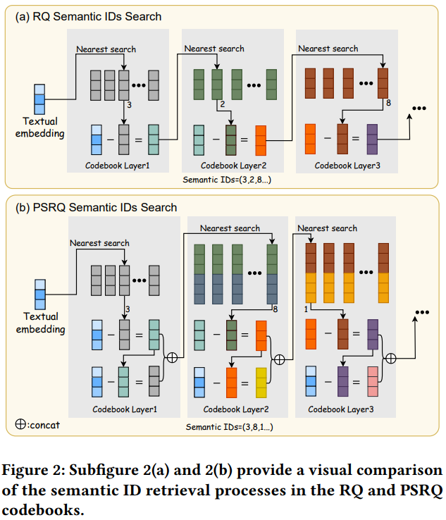 - fig2b是本文新提出的PSRQ量化方法,在RQ-KMeans基础上,每一层除了有上一层的残差向量,还会concat上初始emb减去残差emb后的向量。这样就能区分出残差相似,但初始emb不同的item了,也就避免了RQ方法的沙漏问题,后续semantic id也能保留初始emb的语义信息。fig1d能看出来第二层semantic id仍然能够反映初始emb的分类效果。